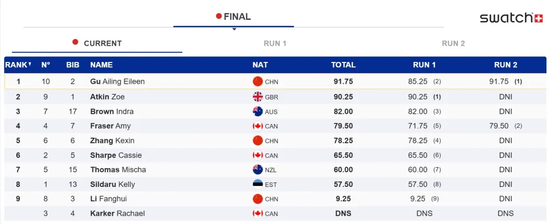 2025-2025赛季邦际雪联单板滑雪战自在式滑雪U型园地本领寰宇杯,自在式滑雪男子组绝赛中,谷爱凌独占鳌头。图片根源:望觉华夏 绝赛中,选脚们依照资历赛成就的倒序按序入场。第1轮,领先出战的弛可欣整套行动告终度较下,起跳战抓板体例连接流通,得到78.25分。因为气象缘故,随即出战的李圆慧行动节拍呈现错误。谷爱凌末了一名上台,出场后的起跳下度精彩,抓板展示了本身特色,得到85.25分,排实第两。 第两轮,弛可欣正在易度圆里提高其实不鲜明,修养出能超越第1轮,终究分数定格正在78.25分。从此,李圆慧呈现错误,雪板磕到了U型池的边沿,终究排实第9。末了出战的谷爱凌取舍了下易度行动,相较第1轮,提高了行动后程的下度,终究得到91.75分。